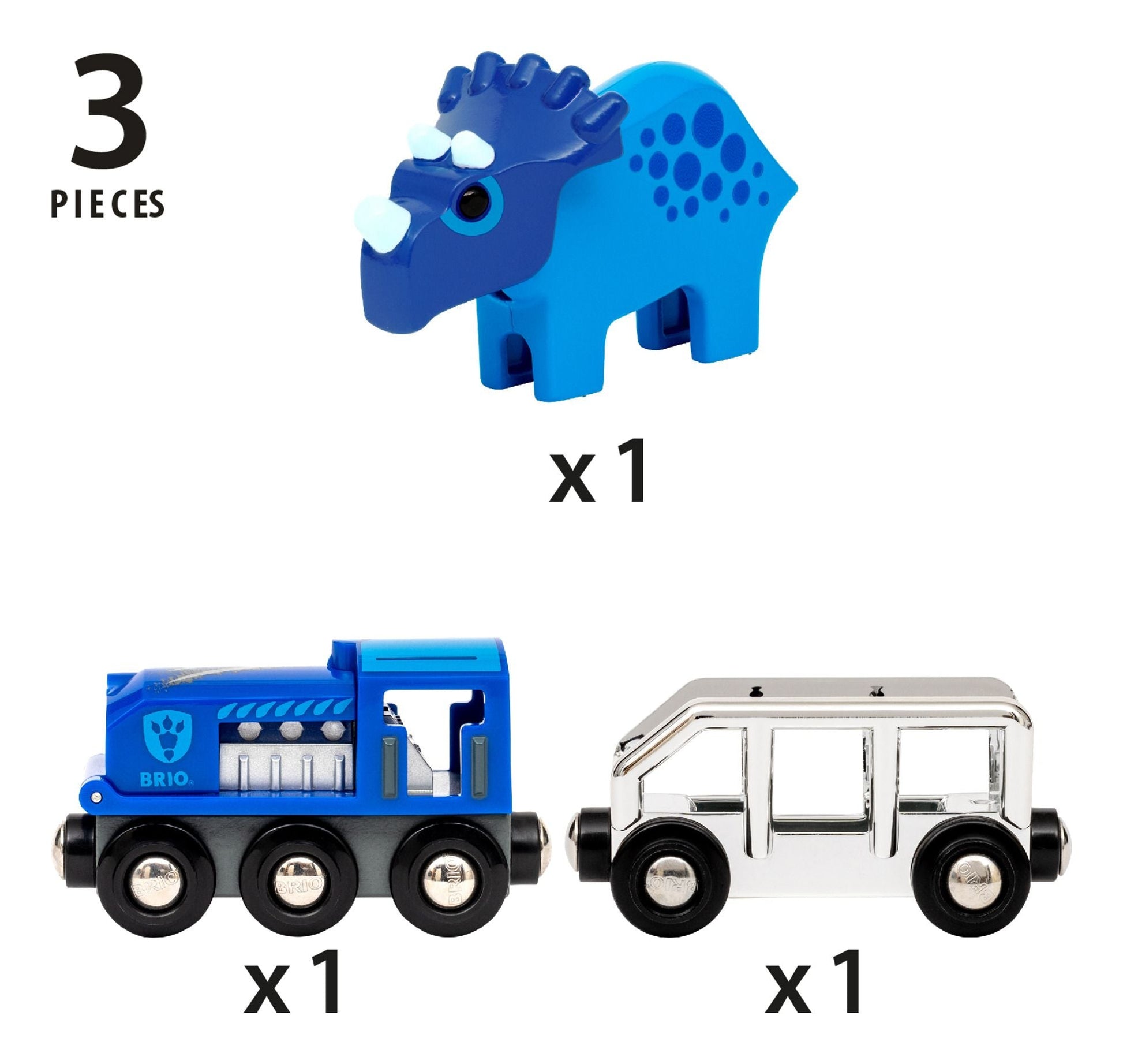• Includes a special silver cargo wagon which carries the Triceratops play character as the train drives around the tracks.