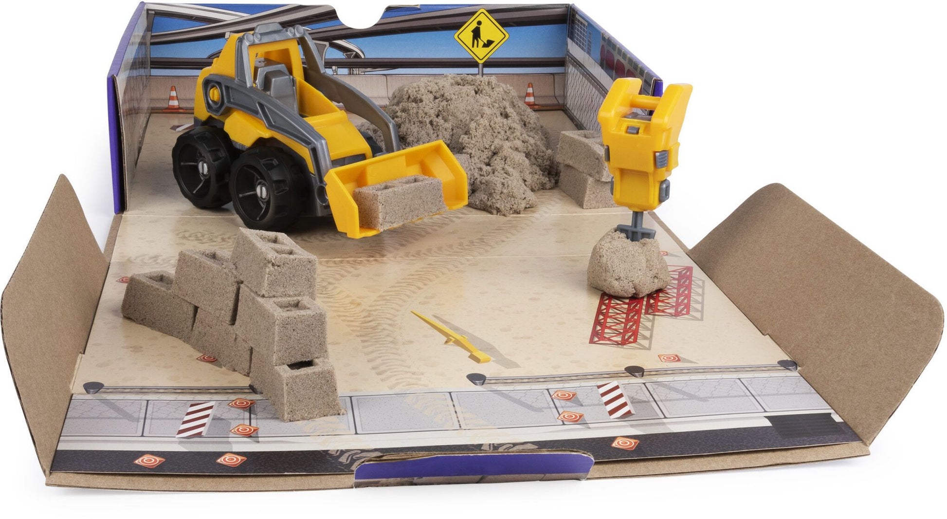 Build, dig and crush with the Kinetic Sand Dig & Demolish playset! This themed sand kit includes everything you need for real Kinetic Sand construction fun: 1lb of brown coloured sand, a brick mold and a 2-in-1 construction truck toy! Kinetic Sand is the original magical, moldable and mesmerizing sensory sand. It flows through your hands and never dries out so you can play again and again. Build a brick wall using the brick mold and clip the jackhammer attachment onto the truck. Crush the wall and start all over! Switch the attachments on the truck and scoop the Kinetic Sand to move it around the construction site! The Dig & Demolish box even opens up into an enclosed construction play space. When you’re finished playing, pack everything away inside the box until next time for easy storage. Let Kinetic Sand flow through your hands – it’s so satisfying, you won’t be able to put it down! Kinetic Sand is made from natural sand and is wheat, gluten and casein free. This construction-themed Kinetic Sand sensory toy is perfect for kids ages 3 and up. Create with the Kinetic Sand Dig & Demolish Set again and again and have hours of construction fun!