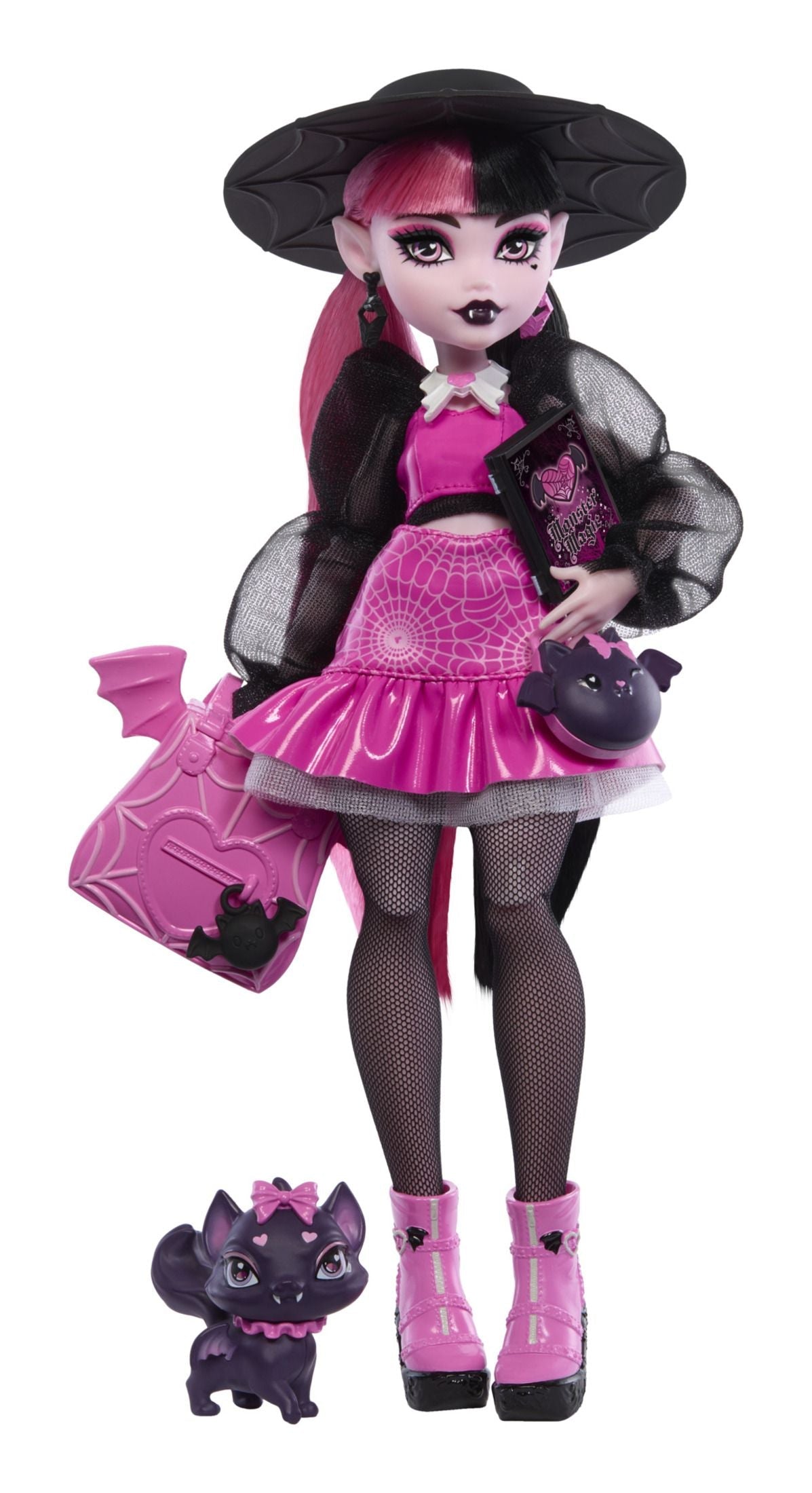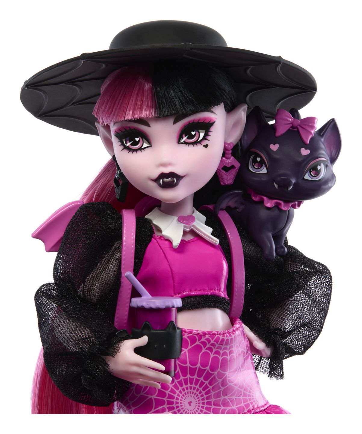 • Monster High Draculaura doll looks vamptastic in a wicked-cute outfit! She comes with her pet Count Fabulous, as well as defrightful accessories.