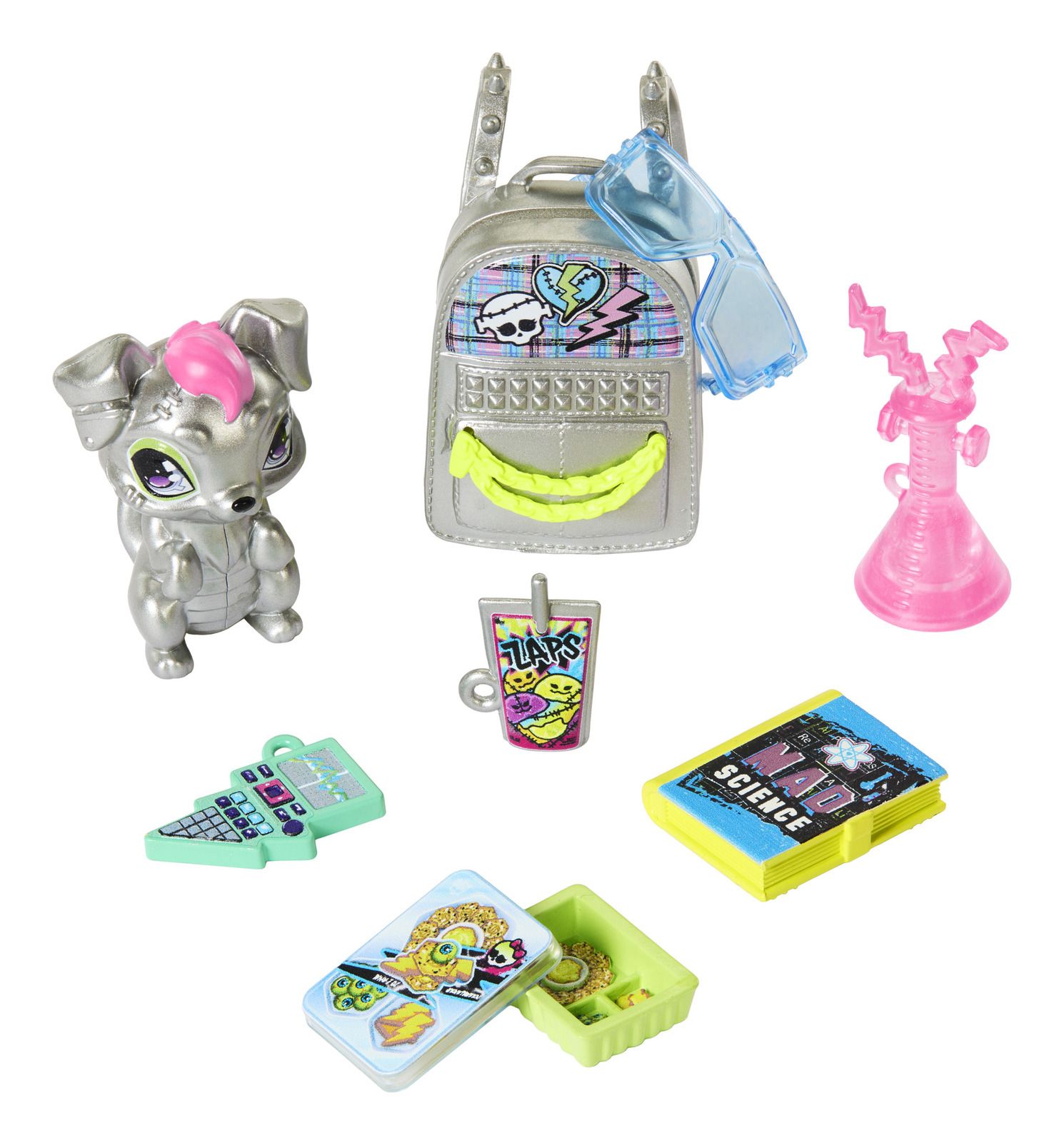 • Accessories add to storytelling possibilities: a silvery backpack, mad science notebook, chemistry beaker, lightning bolt calculator, sunnies, a to-go lunch and zappy juice.